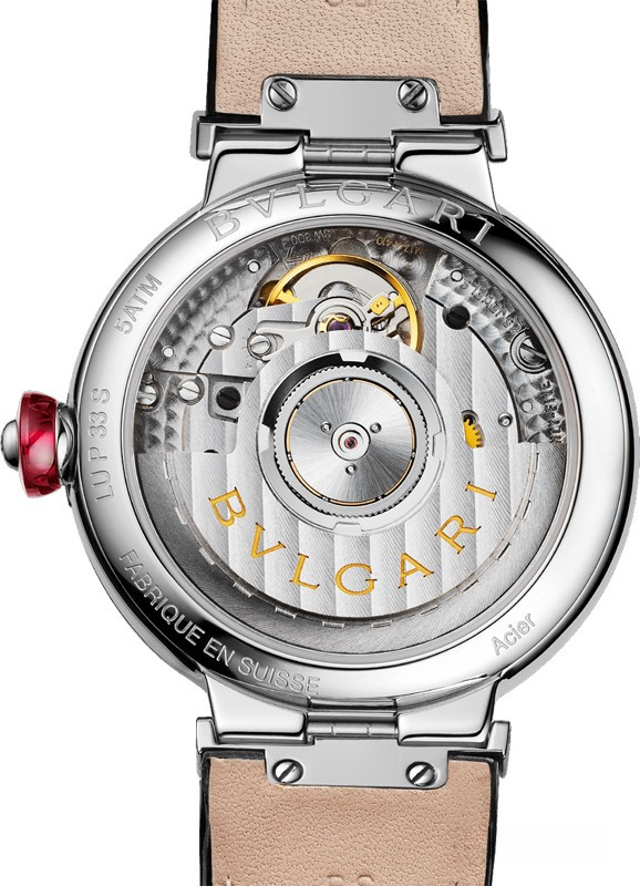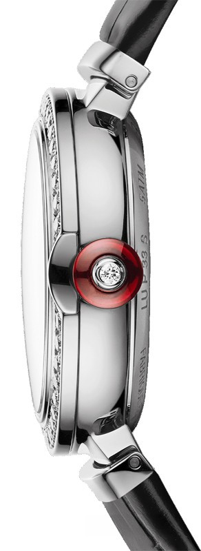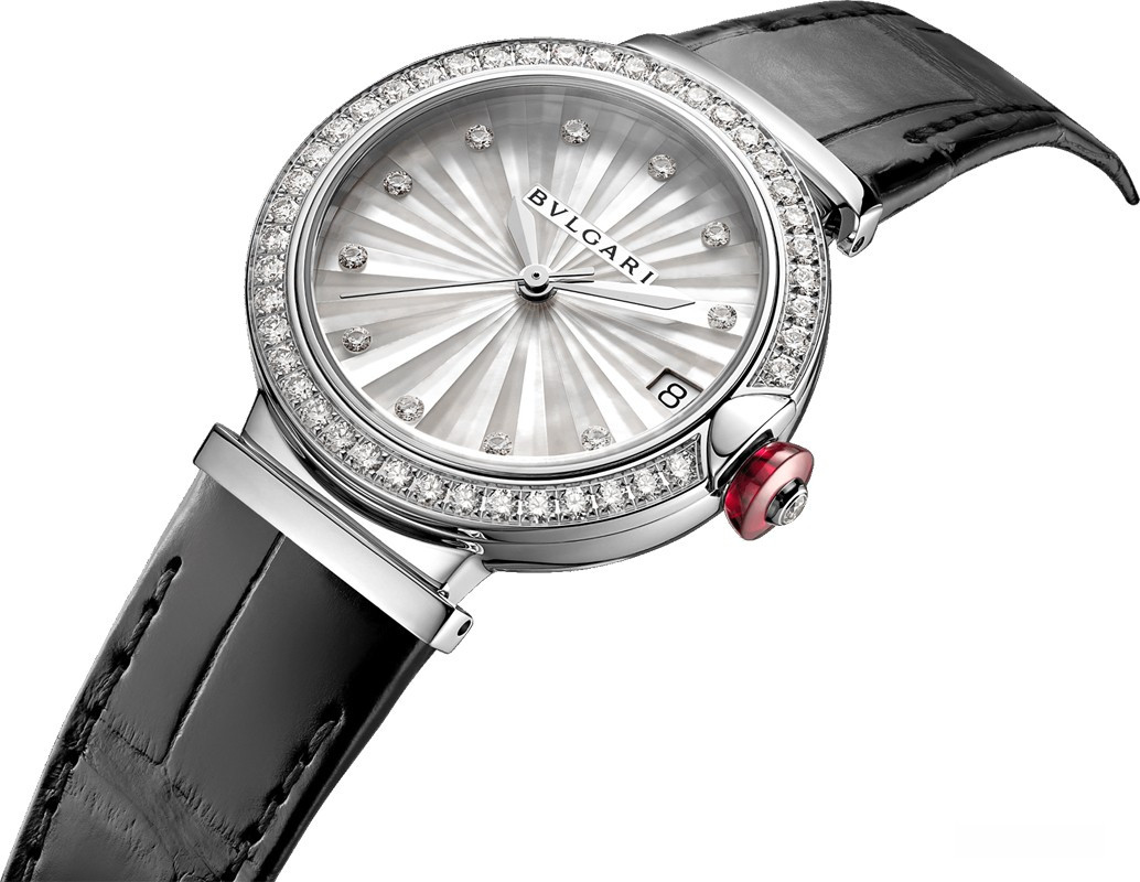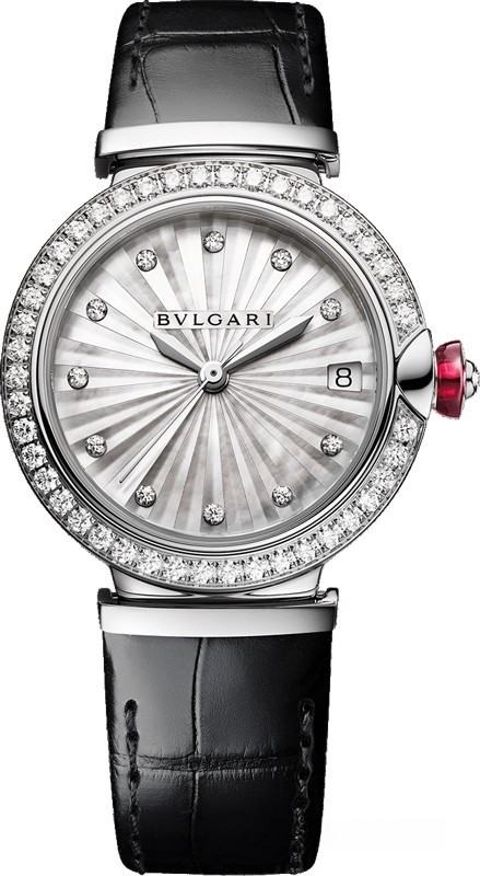 Часы Bvlgari Lvcea представлены в корпусе из нержавеющей стали размером 33 мм и водонепроницаемостью 30 метров. Внутри корпуса установлен автоматический механизм. На белом жемчужном гильошированном циферблате с 12-ю белыми бриллиантами отображаются часы, минуты, секунды, дата. Часы поставляются на ремешке из кожи аллигатора с вставкой из нержавеющей стали. Безель из белых бриллиантов.