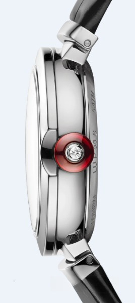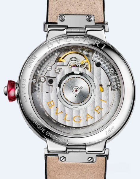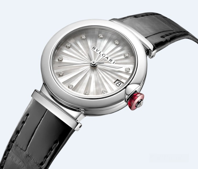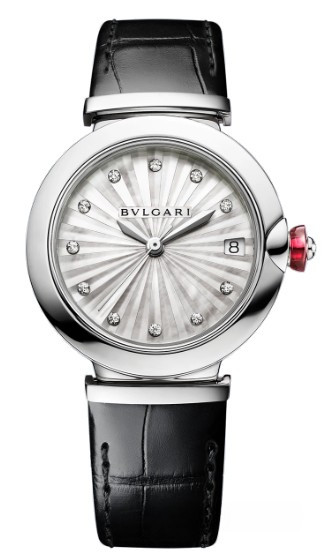 Часы Bvlgari Lvcea представлены в корпусе из нержавеющей стали размером 33 мм и водонепроницаемостью 30 метров. Внутри корпуса установлен автоматический механизм. На белом жемчужном гильошированном циферблате с 12-ю белыми бриллиантами отображаются часы, минуты, секунды. Часы поставляются на ремешке из кожи аллигатора в вставкой из нержавеющей стали.