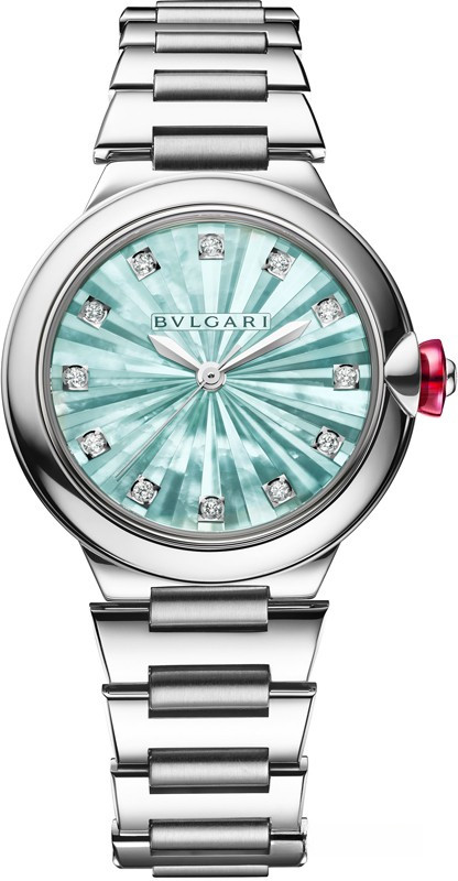 Часы Bvlgari Lvcea представлены в корпусе из нержавеющей стали размером 33 х 9.16 мм и водонепроницаемостью 30 метров. Внутри корпуса установлен автоматический механизм. На голубом жемчужном гильошированном циферблате с 12-ю белыми бриллиантами отображаются часы, минуты, секунды. Часы поставляются на браслете из нержавеющей стали.