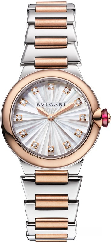 Часы Bvlgari Piccola Lvcea 28 mm представлены в круглом корпусе из нержавеющей стали и рорзовогомзолота 18к диаметром 28 мм и водонепроницаемостью 30 метров. Внутри корпуса установлен кварцевый механизм. На белом жемчужном гильошированном циферблате с 12-ю белыми бриллиантами отображаются часы, минуты. Часы комплектуются браслетом из нержавеющей стали и розового золота 18к. Безель из белых бриллиантов.