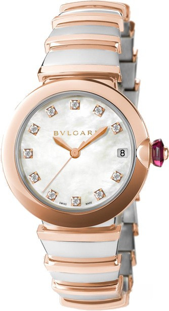 Часы Bvlgari Lvcea представлены в корпусе из нержавеющей стали и розового золота 18к размером 33 мм и водонепроницаемостью 30 метров. Внутри корпуса установлен автоматический механизм, Калибр В77 с запасом хода 42 часа. На белом жемчужном циферблате с 12-ю белыми бриллиантами отображаются часы, минуты, секунды, дата. Часы поставляются на браслете из нержавеющей стали и розового золота 18к.
