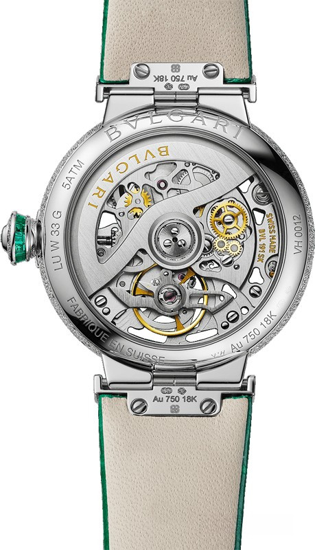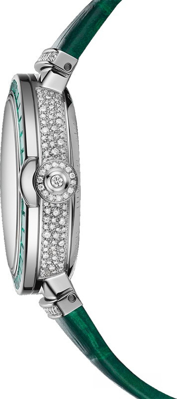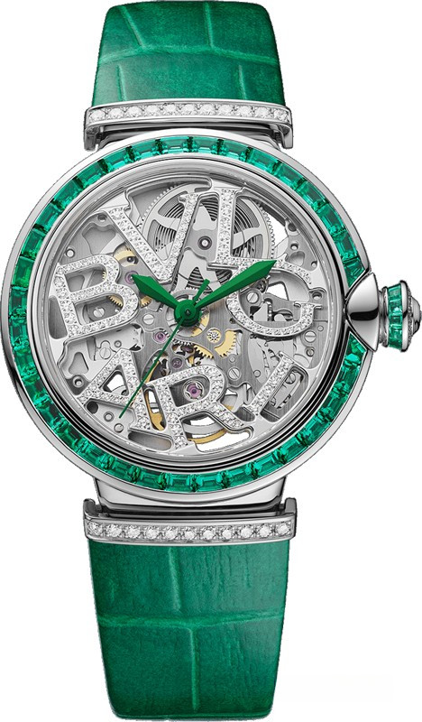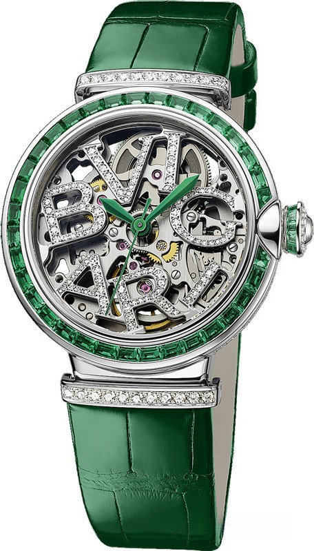Часы Bvlgari Lvcea Skeleton представлены в корпусе размером 33 мм из белого золота 18к с водонепроницаемостью до 50 метров. Внутри корпуса установлен автоматический механизм, Калибр BVL 191SK, обладающий запасом хода 42 часа. На серебристом скелетированном циферблате с белыми бриллиантами отображаются часы, минуты. Часы поставляются на ремешке из кожи аллигатора с вставкой из белого золота 18к. Корпус инкрустирован белыми бриллиантами и зелеными изумрудами.