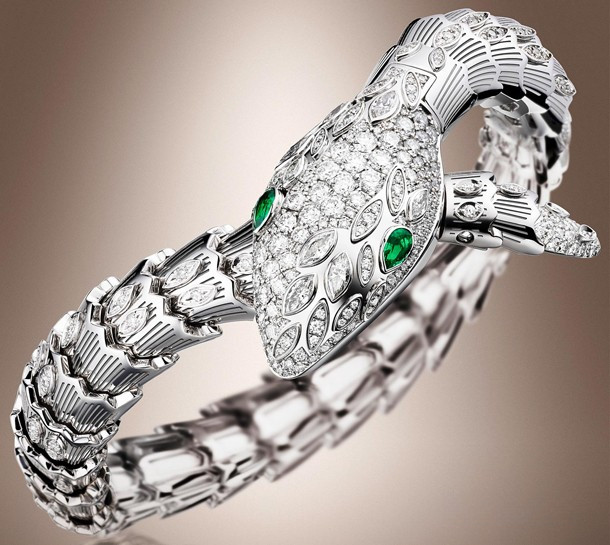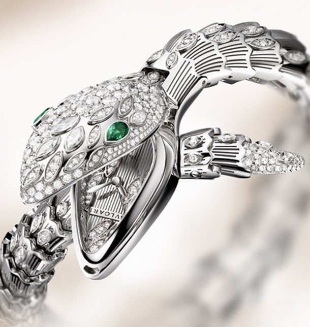 Bulgari High Jewellery Serpenti представлены в корпусе из белого золота, инкрустированы брилиантами на корпусе, браслете и циферблате. На голове змеи установлены грушевидные изумруды - змеиные глаза, которые возвели Serpenti в статус вечного образа Модного дома. Прекрасные с функциональной точки зрения челюсти змеи открываются, чтобы показать время высокоточного кварцевого механизма. Между тем часы охватывают запястье несколько необычным способом: впервые была применена идея дизайна в форме «голова над хвостом». В результате, часы Serpenti от Bulgari стали первыми, воплотившими эту концепцию. Корпус Bulgari High Jewellery Serpenti инкрустирован 8 бриллиантами огранки маркиза, 159 круглыми бриллиантами и 2 изумрудами грушевидной формы. Мифическая змея является иконой дизайна от Bulgari с 1940 года. Со времен Древнего Египта она символизирует вечность, женственность и процветание. Змея всегда была мощным талисманом, гарантируя защиту и силу тем, кто ее носит.