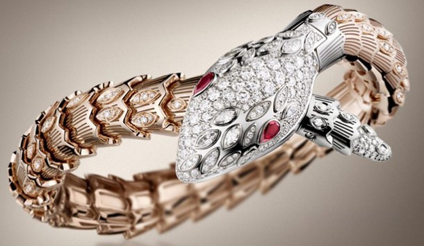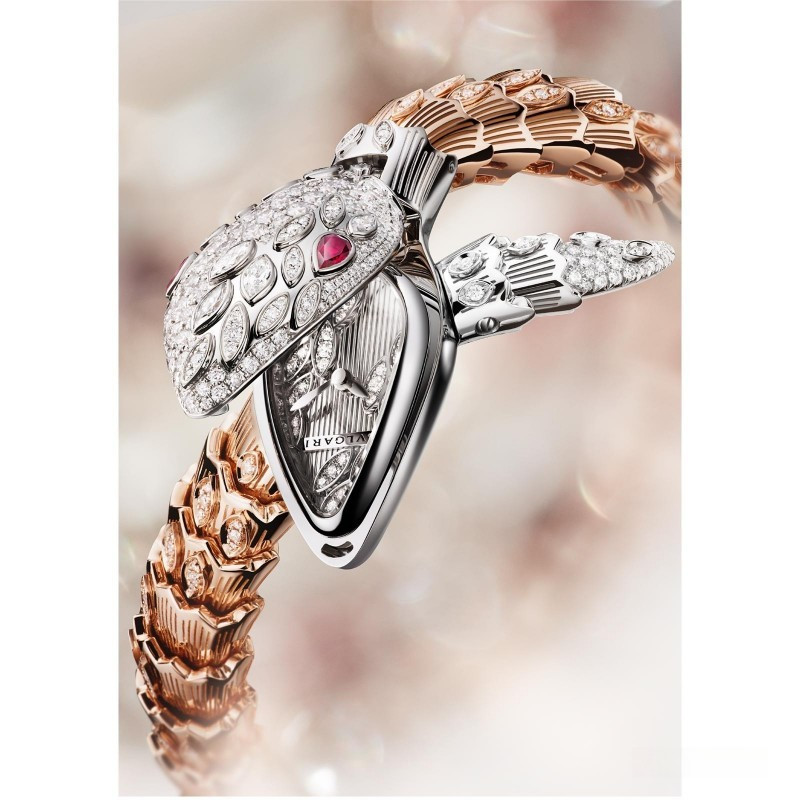 Bulgari High Jewellery Serpenti представлены в корпусе из белого золота, инкрустированы брилиантами на корпусе, браслете и циферблате. На голове змеи установлены грушевидные гранаты - змеиные глаза, которые возвели Serpenti в статус вечного образа Модного дома. Прекрасные с функциональной точки зрения челюсти змеи открываются, чтобы показать время высокоточного кварцевого механизма. Между тем часы охватывают запястье несколько необычным способом: впервые была применена идея дизайна в форме «голова над хвостом». В результате, часы Serpenti от Bulgari стали первыми, воплотившими эту концепцию. Корпус Bulgari High Jewellery Serpenti инкрустирован 8 бриллиантами огранки маркиза, 159 круглыми бриллиантами и 2 гранатами грушевидной формы. Мифическая змея является иконой дизайна от Bulgari с 1940 года. Со времен Древнего Египта она символизирует вечность, женственность и процветание. Змея всегда была мощным талисманом, гарантируя защиту и силу тем, кто ее носит.
