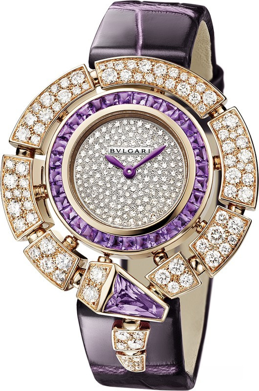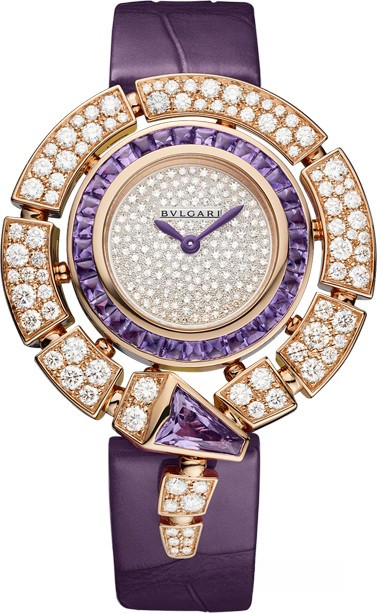 Часы Serpenti Incantati представлены в корпусе из розового золота 18к диаметром 37 мм водонепроницаемостью 30 метров. Внутри корпуса установлен кварцевый механизм. На циферблате с белыми бриллиантами отображаются часы, минуты. Часы комплектуются ремешком из кожи аллигатора с вставкой из розового золота 18к. Корпус инкрустирован белыми бриллиантами и фиолетовыми аметистами.