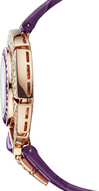 водонепроницаемость 30 м, корпус инкрустирован белыми бриллиантами и фиолетовыми аметистами
