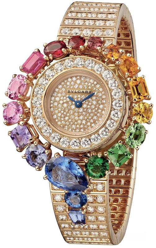 водонепроницаемость 30 м, корпус инкрустирован белыми бриллиантами, разноцветными сапфирами