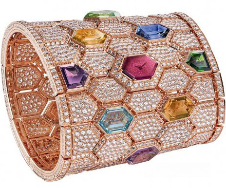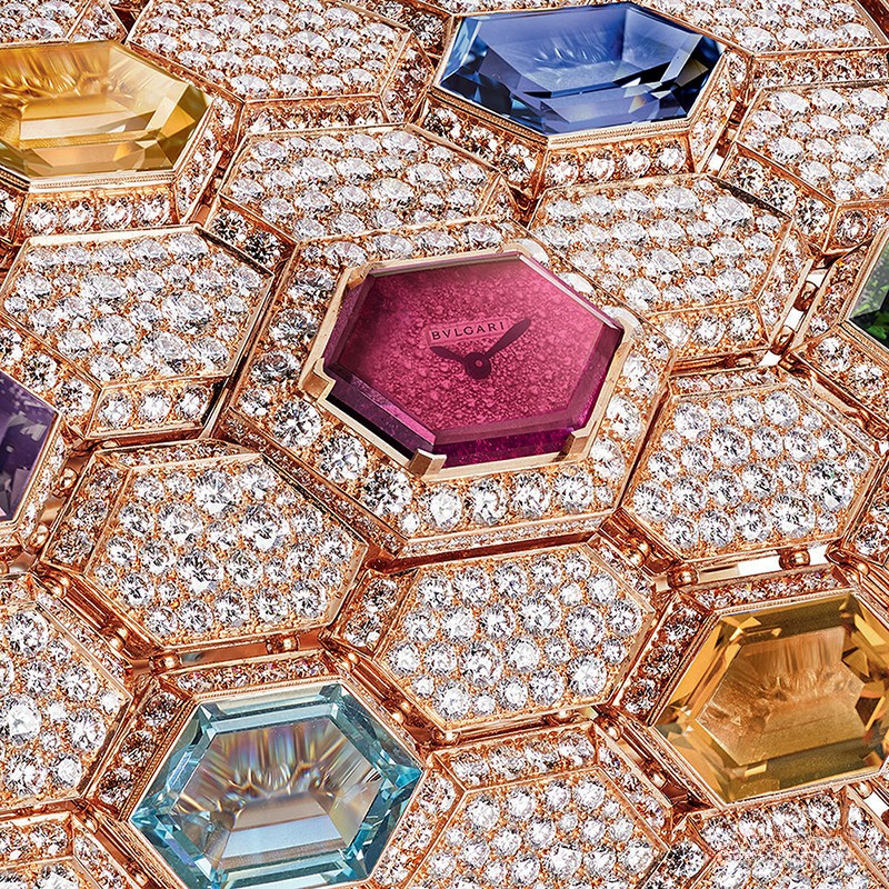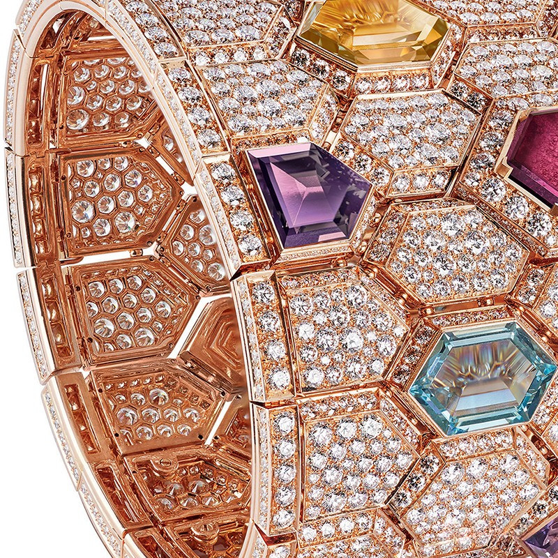 Часы-манжета Bulgari Serpenti Misteriosi Cleopatra 103519 изготовлены в одном экземпляре. Манжета состоит из шестиугольных звеньев, имитирующих чешую змеи. Часы инкрустированы 4000 бриллиантами и перемежаются яркой смесью 88 карат драгоценных камней, включая аквамарины, цитрины, турмалины, танзанит и перидот. Циферблат скрыт под кусочком рубеллита вишневого цвета. Корпус изготовлен из розового золота, диаметром 20 мм. Часы работают на основе кварцевого механизма.