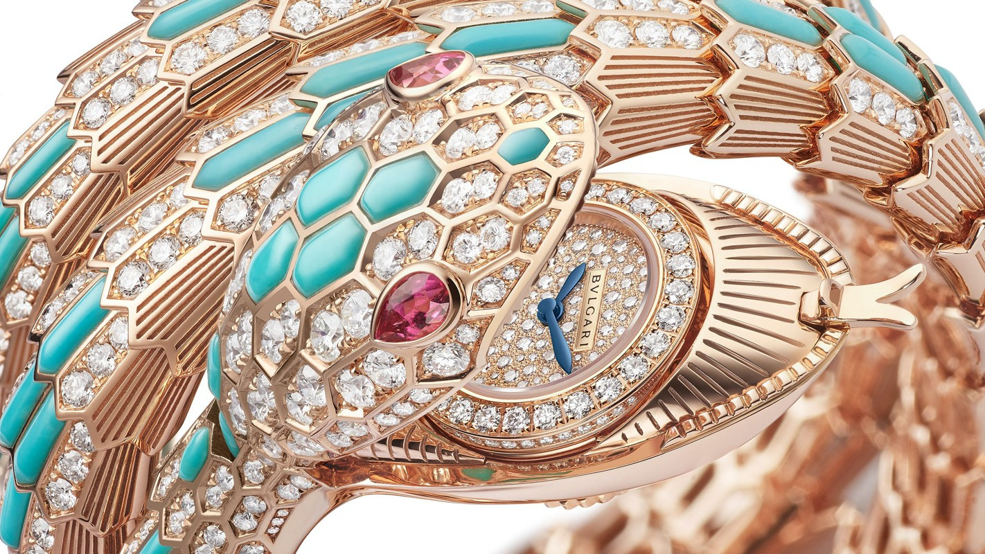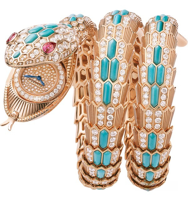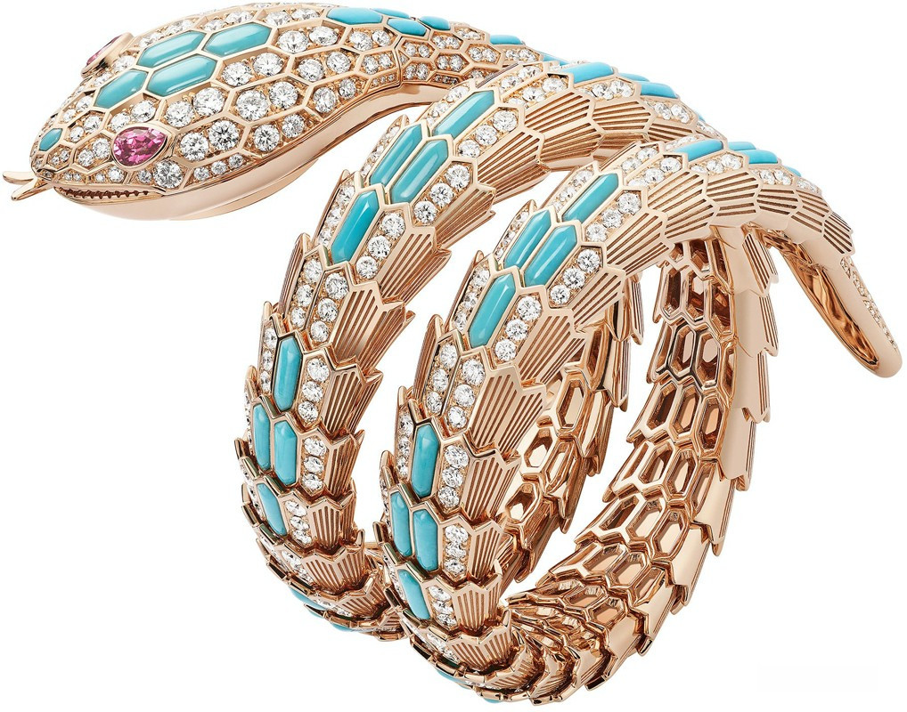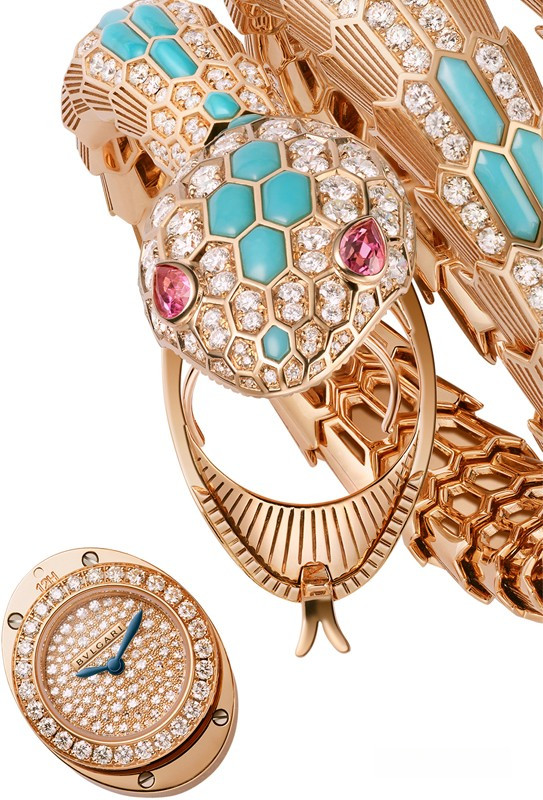 Часы Bulgari Serpenti Misteriosi High Jewelry Secret 103558 – это часы с секретом из розового золота с бриллиантами и вставками из бирюзы. Секрет заключается в скрытом циферблате, что спрятан внутри пасти змеи, которую можно открыть, нажимая на раздвоенный язык. Корпус диаметром 40 мм из розового золота с бриллиантами и вставками из бирюзы изготовлен из сегментов, которые затем собираются вокруг спиральной пружины в форме лезвия, что придает готовым часам гибкость и эластичность. Глаза змеи представляют два рубеллита грушевидной огранки для глаз (~0,4 карата). Циферблат часов украшен бриллиантовым паве. Всего на этой модели установлено 724 бриллианта (~18,05 карата). Часы работают на сверхмалом механизме, Калибр BVL 100. Запас хода 30 часов. Браслет из розового золота инкрустирован бриллиантами и вставками из бирюзы. Серия ограничена - 1 шт.