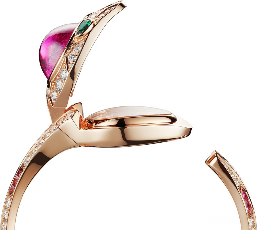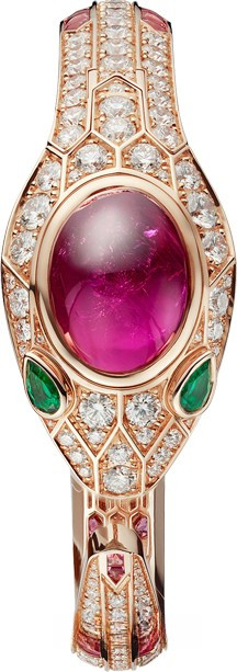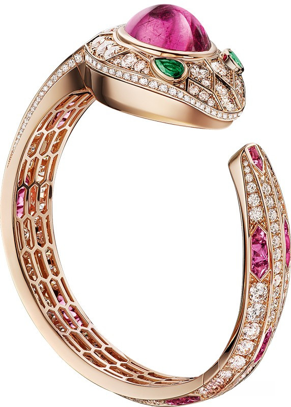 Часы Bvlgari Serpenti Secret представлены в корпусе из розового золота 18к размером 36 мм и водонепроницаемостью 30 метров. Внутри корпуса установлен кварцевый механизм. На циферблате из белых бриллиантов отображаются часы, минуты. Часы поставляются на браслете из розового золота 18к с белыми бриллиантами и розовыми турмалинами. Корпус инкрустирован белыми бриллиантами, розовым турмалином кабошоном и зелеными изумрудами.