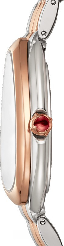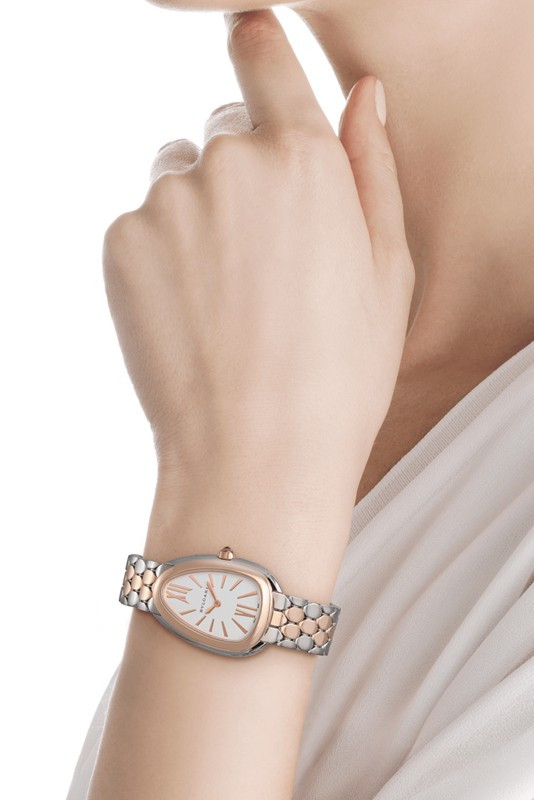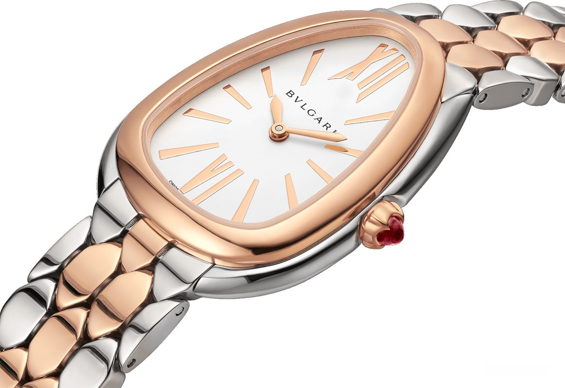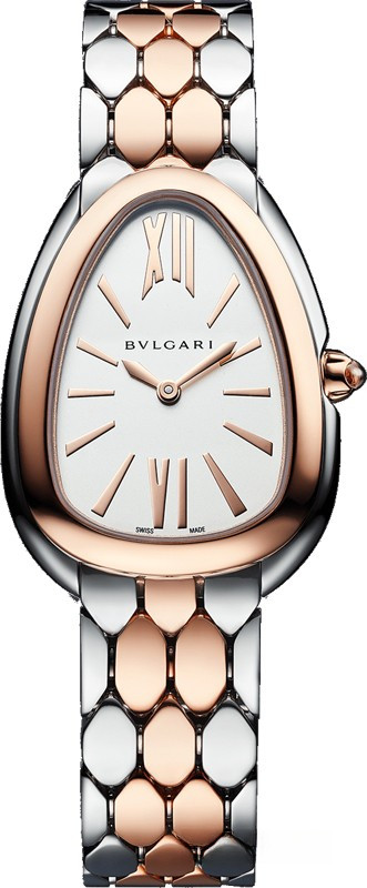 Часы Bvlgari Serpenti Seduttori представлены в корпусе из нержавеющей стали и розового золота 18к размером 33 мм водонепроницаемостью 30 метров. Внутри корпуса установлен кварцевый механизм. На серебристом циферблате отображаются часы, минуты. Часы поставляются на браслете из нержавеющей стали и розового золота 18к.