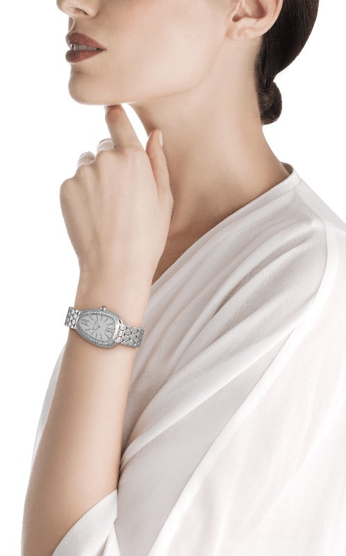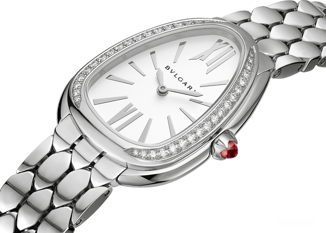 Часы Bvlgari Serpenti Seduttori представлены в корпусе из нержавеющей стали размером 33 мм водонепроницаемостью 30 метров. Внутри корпуса установлен кварцевый механизм. На белом циферблате отображаются часы, минуты. Часы поставляются на браслете из нержавеющей стали. Безель из белых бриллиантов.