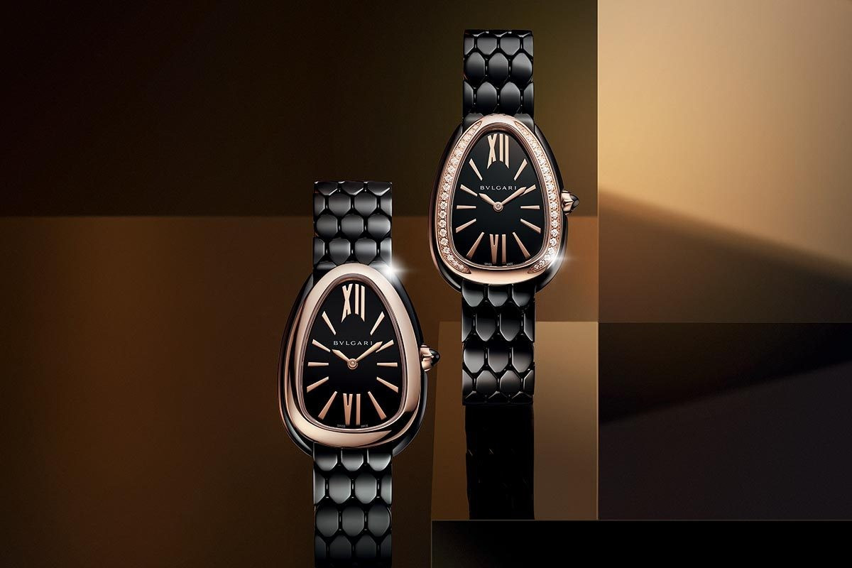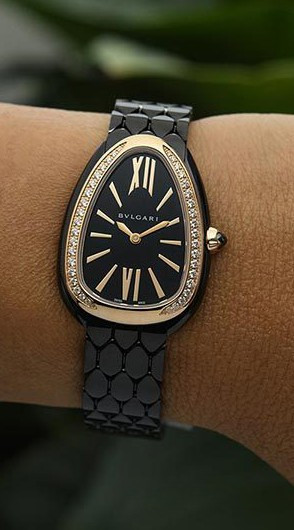 Часы Bvlgari Serpenti Seduttori представлены в корпусе из розового золота 18к и нержавеющей стали с покрытием DLC размером 33 мм водонепроницаемостью 30 метров. Внутри корпуса установлен кварцевый механизм. На черном циферблате отображаются часы, минуты. Часы поставляются на кожаном ремешке с золотой застежкой. Безель из белых бриллинтов.