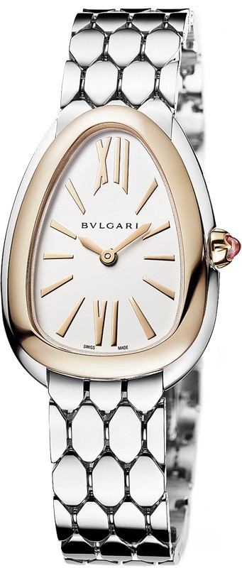 Часы Bvlgari Serpenti Seduttori представлены в корпусе из нержавеющей стали и розового золота 18к размером 33 мм водонепроницаемостью 30 метров. Внутри корпуса установлен кварцевый механизм. На серебристом циферблате отображаются часы, минуты. Часы поставляются на браслете из нержавеющей стали.