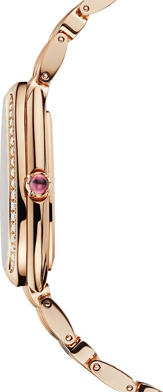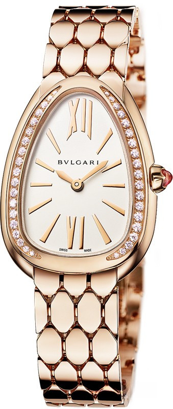 Часы Bvlgari Serpenti Seduttori представлены в корпусе из розового золота 18к размером 33 мм водонепроницаемостью 30 метров. Внутри корпуса установлен кварцевый механизм. На серебристом циферблате отображаются часы, минуты. Часы поставляются на браслете из розового золота 18к. Безель из белых бриллиантов.