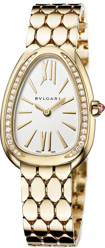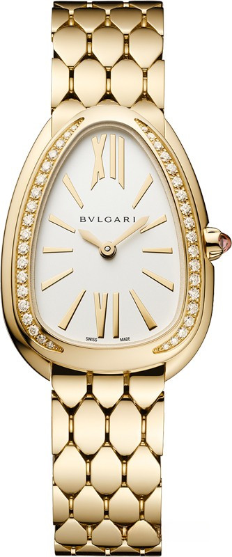 Часы Bvlgari Serpenti Seduttori представлены в корпусе из желтого золота 18к размером 33 мм водонепроницаемостью 30 метров. Внутри корпуса установлен кварцевый механизм. На серебристом циферблате отображаются часы, минуты. Часы поставляются на браслете из желтого золота 18к. Безель из белых бриллиантов.