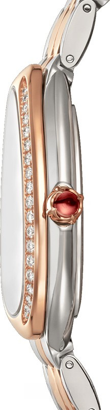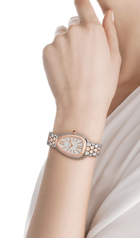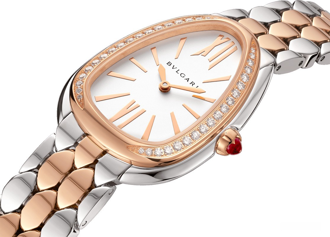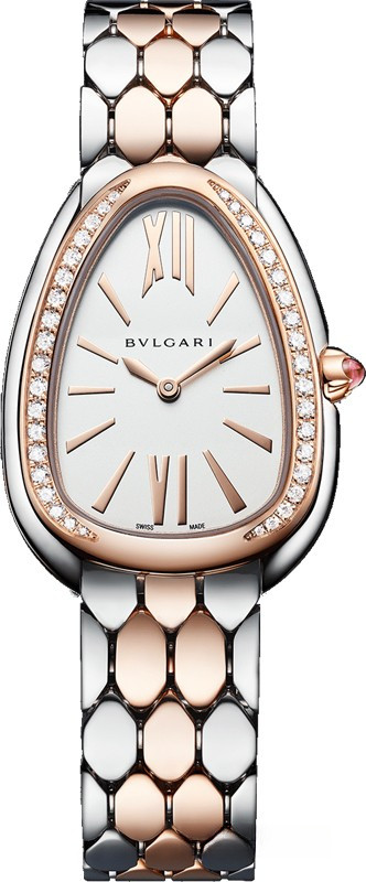 Часы Bvlgari Serpenti Seduttori представлены в корпусе из нержавеющей стали и розового золота 18к размером 33 мм водонепроницаемостью 30 метров. Внутри корпуса установлен кварцевый механизм. На серебристом циферблате отображаются часы, минуты. Часы поставляются на браслете из нержавеющей стали и розового золота 18к. Безель из белых бриллиантов.