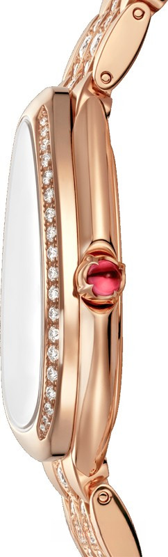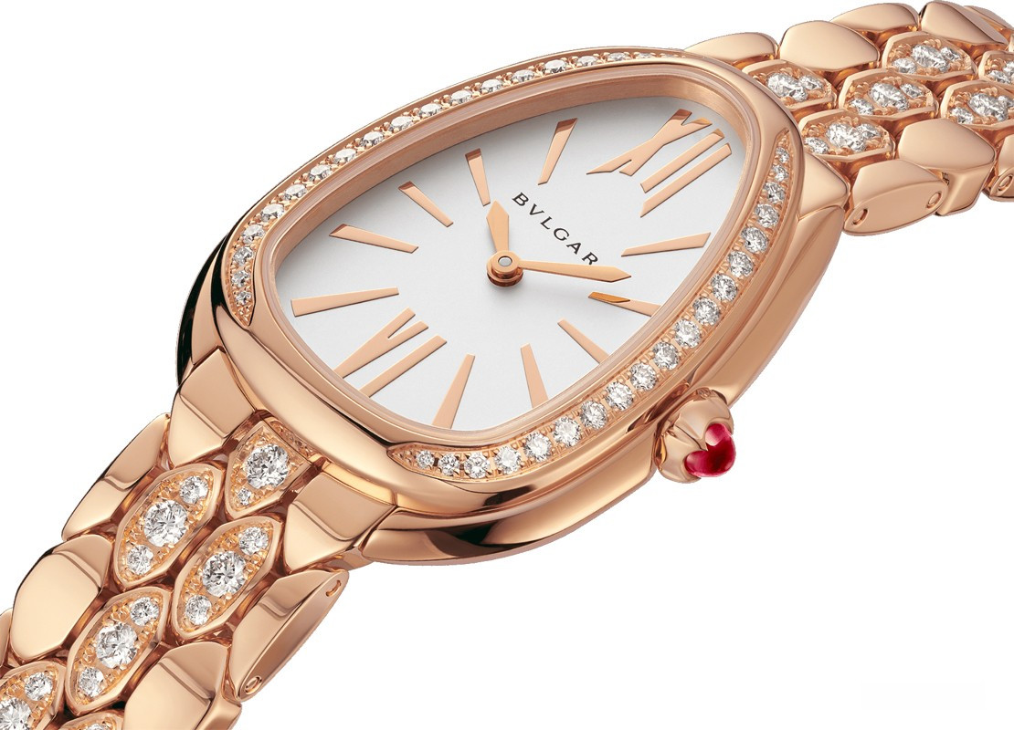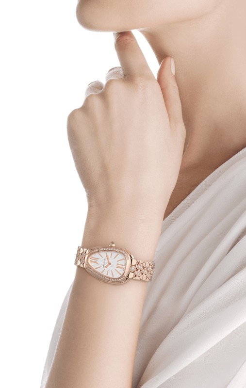 Часы Bvlgari Serpenti Seduttori представлены в корпусе из розового золота 18к размером 33 мм водонепроницаемостью 30 метров. Внутри корпуса установлен кварцевый механизм. На серебристом циферблате отображаются часы, минуты. Часы поставляются на браслете из розового золота 18к, инкрустированном белыми бриллиантами. Безель из белых бриллиантов.