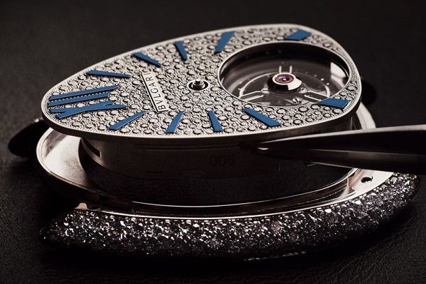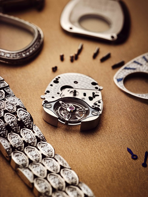 Часы Bvlgari Serpenti Seduttori Tourbillon представлены в корпусе из белого золота 18к размером 34 х 8.9 мм водонепроницаемостью 30 метров. Внутри корпуса установлен механизм с ручным заводом, Калибр BVL150, обладающий запасом хода 40 часов. На циферблате с белыми бриллиантами отображаются часы, минуты. Часы поставляются на браслете из белого золота 18к, инкрустированном белыми бриллиантами. Корпус инкрустирован белыми бриллиантами.