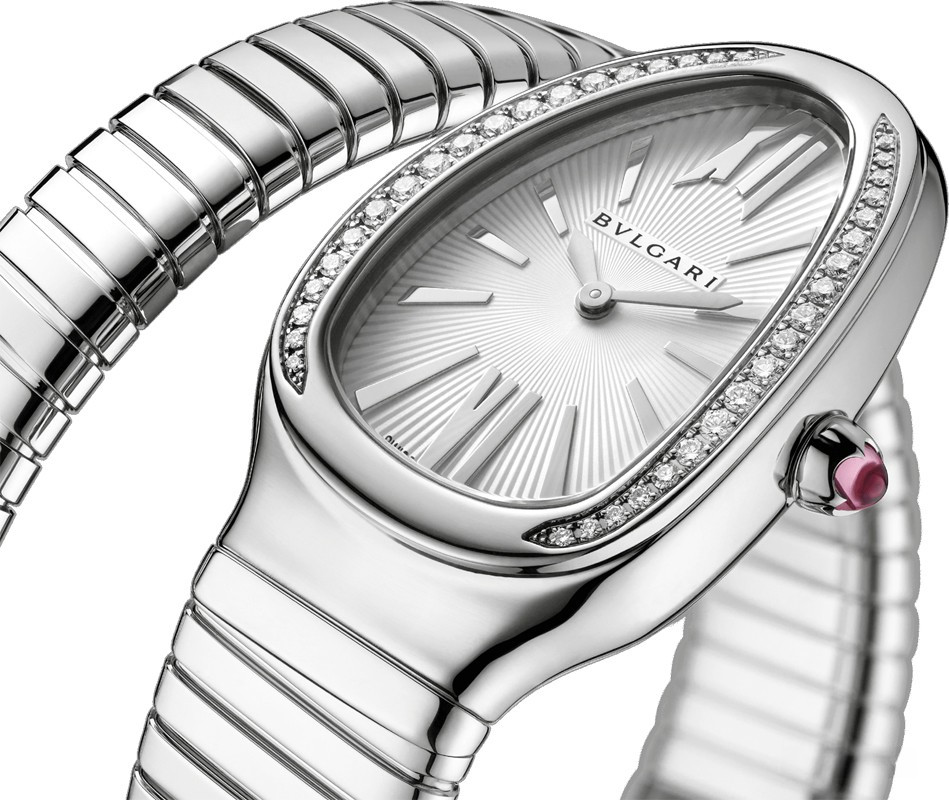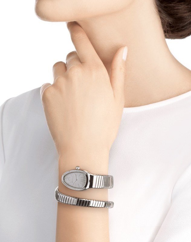Часы Bvlgari Serpenti 1Т представлены в корпусе из нержавеющей стали размером 35 мм и водонепроницаемостью 30 метров. Внутри корпуса установлен кварцевый механизм. На серебристом гильошированном циферблате отображаются часы, минуты. Часы поставляются на браслете из нержавеющей стали. Безель из белых бриллиантов.
