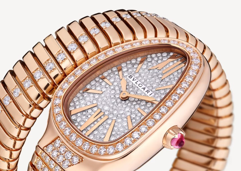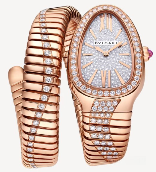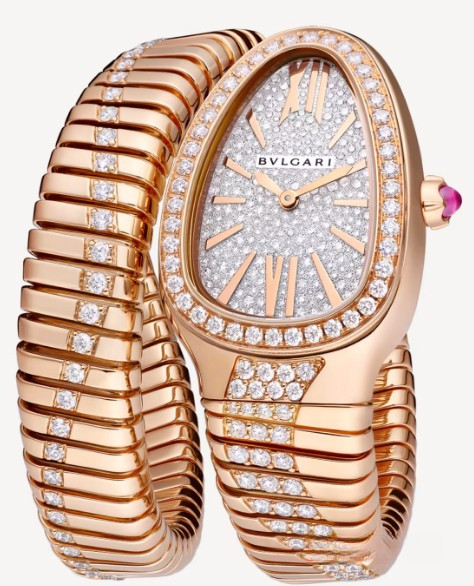 Часы Bvlgari Serpenti 1Т представлены в корпусе из розового золота 18к размером 35 мм и водонепроницаемостью 30 метров. Внутри корпуса установлен кварцевый механизм. На циферблате с белыми бриллиантами отображаются часы, минуты. Часы поставляются на браслете из розового золота 18к, инкрустированном белыми бриллиантами. Безель из белых бриллиантов.