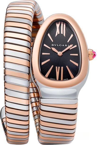 Часы Bvlgari Serpenti 1Т представлены в корпусе из нержавеющей стали и розового золота 18к размером 35 мм и водонепроницаемостью 30 метров. Внутри корпуса установлен кварцевый механизм. На черном гильошированном циферблате отображаются часы, минуты. Часы поставляются на браслете из нержавеющей стали и розового золота 18к.