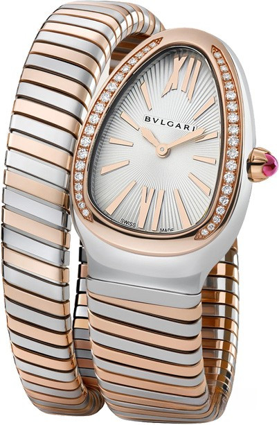 Часы Bvlgari Serpenti 1Т представлены в корпусе из нержавеющей стали и розового золота 18к размером 35 мм и водонепроницаемостью 30 метров. Внутри корпуса установлен кварцевый механизм. На серебристом гильошированном циферблате отображаются часы, минуты. Часы поставляются на браслете из нержавеющей стали и розового золота 18к. Безель из белых бриллиантов.