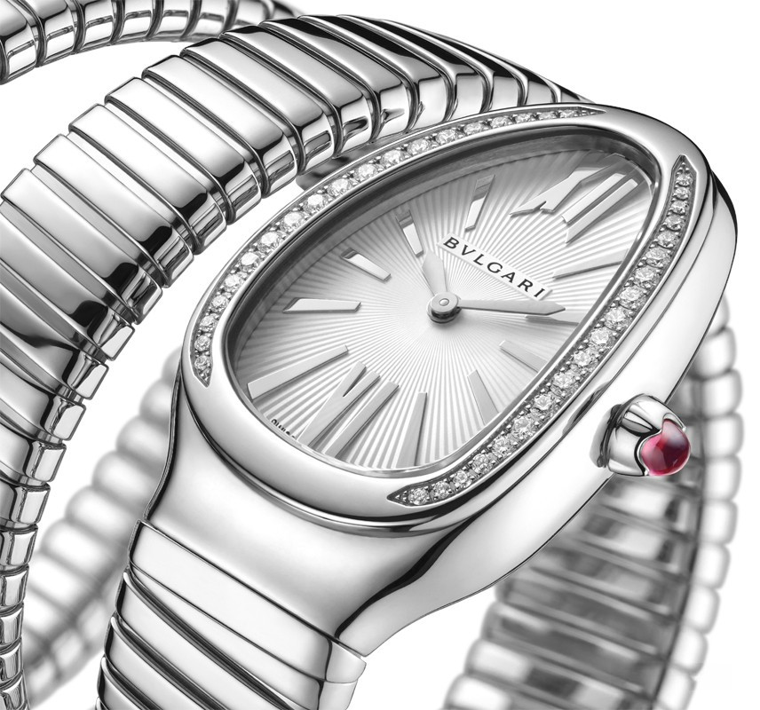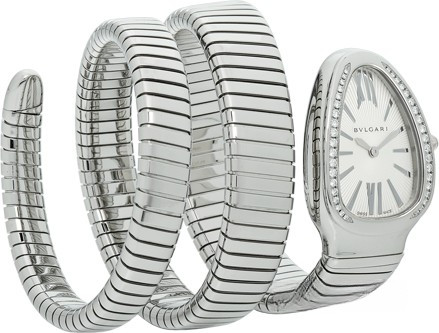 Часы Bvlgari Serpenti 2Т представлены в корпусе из нержавеющей стали размером 35 мм и водонепроницаемостью 30 метров. Внутри корпуса установлен кварцевый механизм. На серебристом гильошированном циферблате отображаются часы, минуты. Часы поставляются на браслете из нержавеющей стали. Безель из белых бриллиантов.