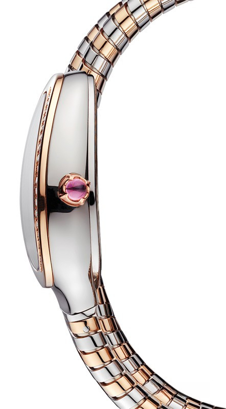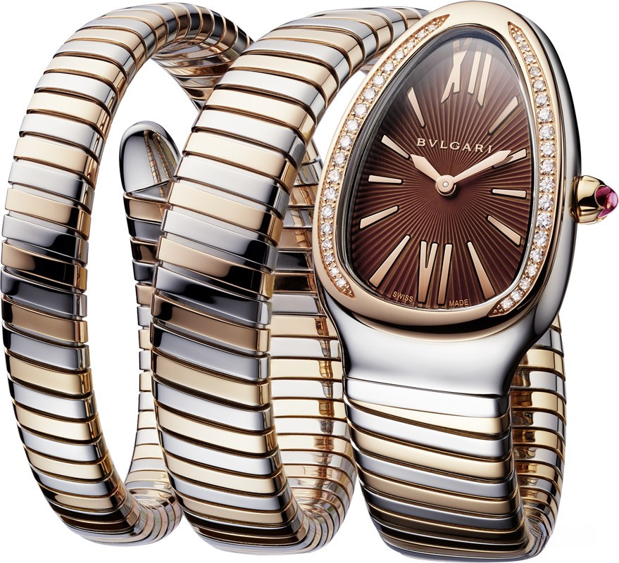 Часы Bvlgari Serpenti 2Т представлены в корпусе из нержавеющей стали и розового золота 18к размером 35 мм и водонепроницаемостью 30 метров. Внутри корпуса установлен кварцевый механизм. На коричневом гильошированном циферблате отображаются часы, минуты. Часы поставляются на браслете из нержавеющей стали и розового золота 18к. Безель из белых бриллиантов.