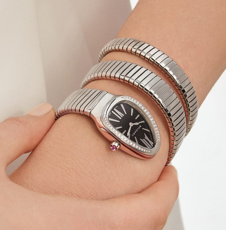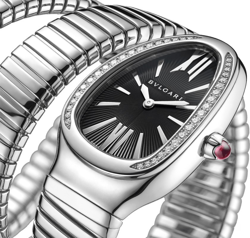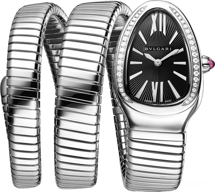 Часы Bvlgari Serpenti 2Т представлены в корпусе из нержавеющей стали размером 35 мм и водонепроницаемостью 30 метров. Внутри корпуса установлен кварцевый механизм. На черном гильошированном циферблате отображаются часы, минуты. Часы поставляются на браслете из нержавеющей стали. Безель из белых бриллиантов.