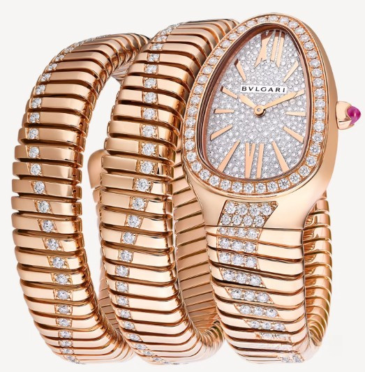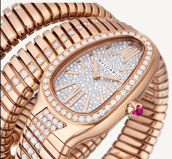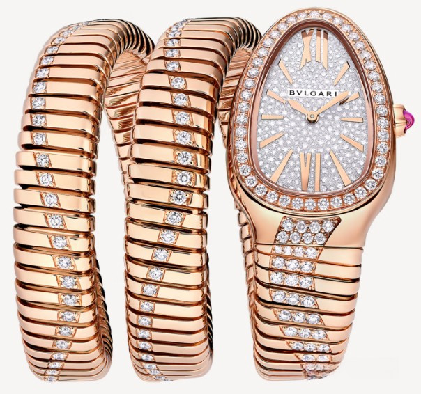 Часы Bvlgari Serpenti 2Т представлены в корпусе из розового золота 18к размером 35 мм и водонепроницаемостью 30 метров. Внутри корпуса установлен кварцевый механизм. На циферблате с белыми бриллиантами отображаются часы, минуты. Часы поставляются на браслете из розового золота 18к, инкрустированном белыми бриллиантами. Безель из белых бриллиантов.