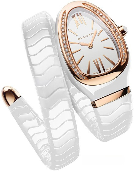 Часы Bvlgari Serpenti Spiga представлены в корпусе из розового золота 18к и керамики размером 35 мм и водонепроницаемостью до 30 метров. Внутри корпуса установлен кварцевый механизм. На белом циферблате отображаются часы, минуты. Часы комплектуются керамическим браслетом. Безель инкрустирован белыми бриллиантами.