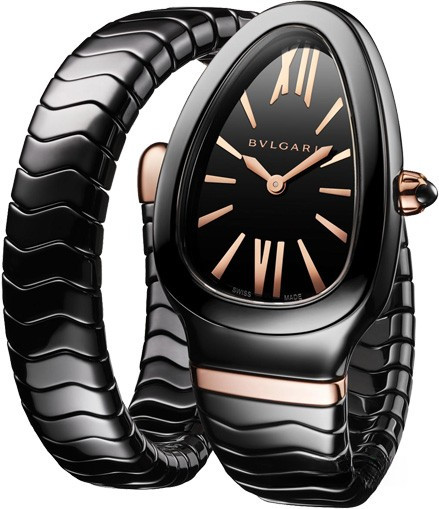 Часы Bvlgari Serpenti Spiga представлены в корпусе из керамики размером 35 мм и водонепроницаемостью до 30 метров. Внутри корпуса установлен кварцевый механизм. На черном циферблате отображаются часы, минуты. Часы комплектуются браслетом из керамики.