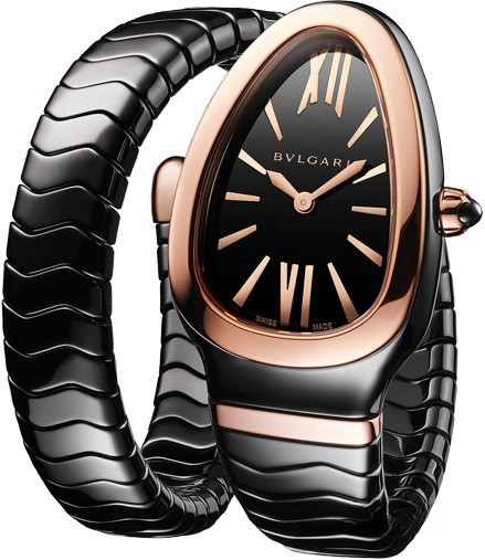 Часы Bvlgari Serpenti Spiga представлены в корпусе из керамики и розового золота 18к размером 35 мм и водонепроницаемостью до 30 метров. Внутри корпуса установлен кварцевый механизм. На черном циферблате отображаются часы, минуты. Часы комплектуются браслетом из керамики.