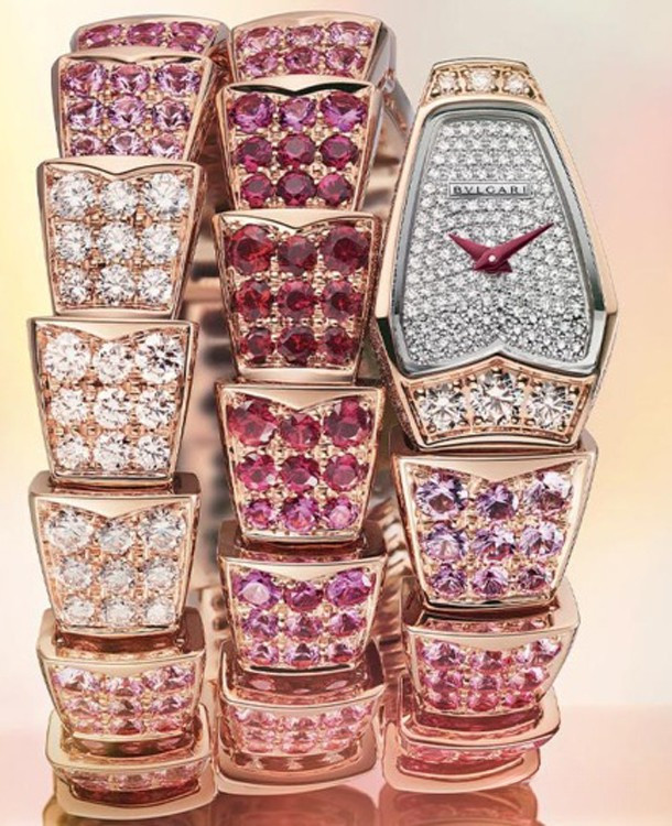 Часы Bvlgari Serpenti Viper Rainbow выпущены в корпусе из розового золота 18к размером 26 мм с водонепроницаемостью 30 м. Внутри корпуса установлен кварцвый механизм. На циферблате с белыми бриллиантами отображаются часы, минуты. Часы комплектуются браслетом из розового золота 18к, инкрустированным белыми бриллиантами, сапфирами, рубинами.