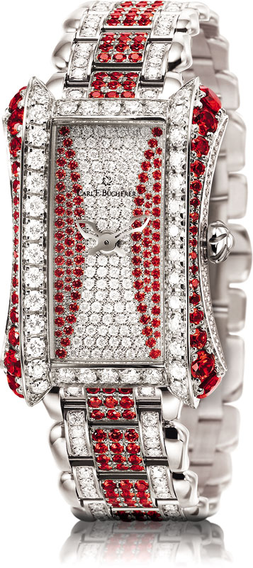 водонепроницаемость 30 м, корпус инкрустирован 100 белыми бриллиантами 2 ct. и 34-ю рубинами 2.4 ct., ограниченная серия (25 шт.)