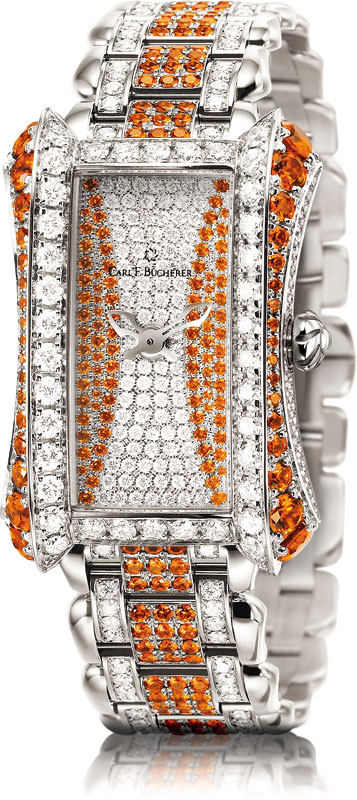 водонепроницаемость 30 м, корпус инкрустирован 100 белыми бриллиантами 2 ct. и 34-ю оранжевыми сапфирами 2.4 ct., серия ограничена (25 шт.)