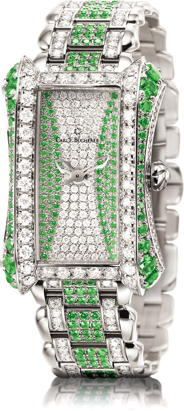 водонепроницаемость 30 м, корпус инкрустирован 38-ю белыми бриллиантами 3 ct. и 34-ю изумрудами 1.7 ct., ограниченная серия (25 шт.)