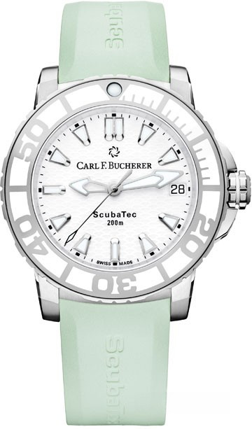 Новые модели Patravi ScubaTec Lady, представленные Carl F. Bucherer, напоминают день, проведенный у моря. Часы комплектуются каучуковыми ремешками ярких цветов и напоминают пальмы (зеленый), океан (синий), песок (розово-бежевый) и закат (коралловый). Летний вид часов усилен белым циферблатом, украшенным извилистым волновым узором. Керамический безель также белого цвета. На часовые маркеры и стрелки нанесено покрытие Super-LumiNova, что придает им светящийся голубой оттенок в условиях слабого освещения. Корпус из нержавеющей стали диаметром 36.5 мм. Защищенная завинчивающаяся заводная головка придает часам повышенную водостойкость до 200 м. Вращающийся безель, покрытие Super-LumiNova и каучуковый ремешок с регулируемой застежкой обеспечивают идеальное оснащение часов для длительных водных прогулок. Часы Patravi ScubaTec Lady комплектуются автоматическим механизмом CFB 1950, который имеет 38-часовой запас хода и включает часовую, минутную и секундную стрелки, а также дату, расположенную на 3-х часах.