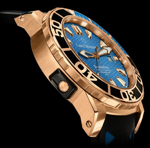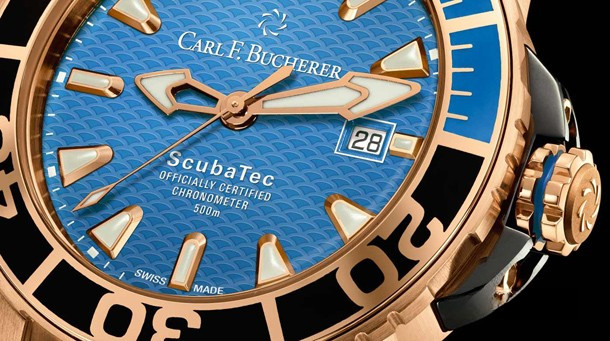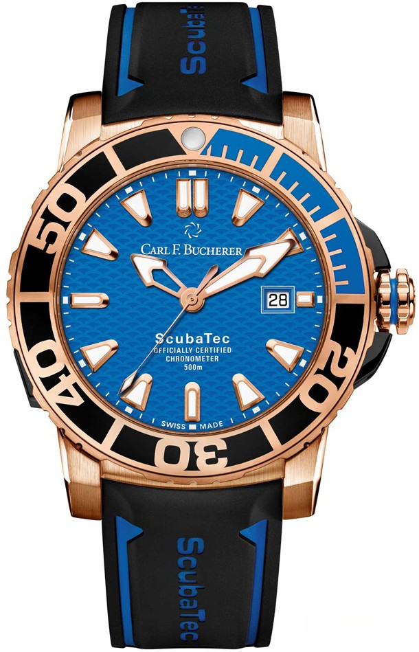 Часы Carl F. Bucherer Patravi ScubaTec изготовлены из розового золота 18к. Черные и синие керамические вкладки на однонаправленно вращающемся безеле создают тон, идеально гармонирующий с материаом корпуса. Синий циферблат имеет блестящую чешуйчатую структуру c бесчисленными мерцаниями подобно эффекту света, падающего на поверхность моря. Оснащенные гелиевым клапаном, люминесцентными стрелками и индексами, ультра точным автоматическим часовым механизмом и прочным браслетом из нержавеющей стали и розового золота 18к, часы Patravi ScubaTec – идеальный компаньон для людей, увлекающихся подводным миром. Водонепроницаемостью до 500 м, часы имеют сапфировое стекло с антибликовым покрытием с обеих сторон. Часы являются сертифицированным хронометром COSC.