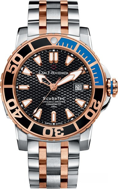 Часы Carl F. Bucherer Patravi ScubaTec изготовлены из нержавеющей стали и розового золота 18к. Черные и синие керамические вкладки на однонаправленно вращающемся безеле создают тон, идеально гармонирующий с материалом корпуса. Черный гильошированный циферблат. Оснащенные гелиевым клапаном, люминесцентными стрелками и индексами, ультра точным автоматическим часовым механизмом и прочным стальным браслетом, часы Patravi ScubaTec – идеальный компаньон для людей, увлекающихся подводным миром. Водонепроницаемостью до 500 м, часы имеют сапфировое стекло с антибликовым покрытием с обеих сторон. Часы являются сертифицированным хронометром COSC.