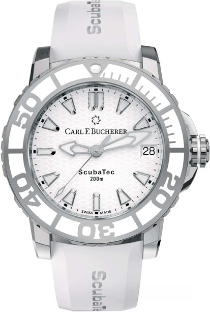 Часы Carl F. Bucherer Patravi ScubaTec изготовлены из нержавеющей стали и керамики. Белые вкладки на однонаправленно вращающемся безеле создают тон, идеально гармонирующий с материалом корпуса. Белый гильошированный циферблат. Оснащенные гелиевым клапаном, люминесцентными стрелками и индексами, ультра точным автоматическим часовым механизмом и прочным каучуковым ремешком, часы Patravi ScubaTec – идеальный компаньон для людей, увлекающихся подводным миром. Водонепроницаемостью до 200 м, часы имеют сапфировое стекло с антибликовым покрытием с обеих сторон. Часы являются сертифицированным хронометром COSC.
