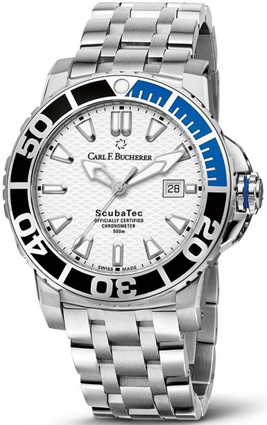 Часы Carl F. Bucherer Patravi ScubaTec изготовлены из нержавеющей стали. Черные и синие керамические вкладки на однонаправленно вращающемся безеле создают тон, идеально гармонирующий с материаом корпуса. Белый циферблат имеет блестящую чешуйчатую структуру c бесчисленными мерцаниями подобно эффекту света, падающего на поверхность моря. Оснащенные гелиевым клапаном, люминесцентными стрелками и индексами, ультра точным автоматическим часовым механизмом и прочным стальным браслетом, часы Patravi ScubaTec – идеальный компаньон для людей, увлекающихся подводным миром. Водонепроницаемостью до 500 м, часы имеют сапфировое стекло с антибликовым покрытием с обеих сторон. Часы являются сертифицированным хронометром COSC.