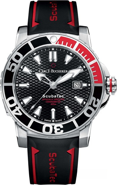 Часы Carl F. Bucherer Patravi ScubaTec изготовлены из нержавеющей стали. Черные и красные керамические вкладки на однонаправленно вращающемся безеле создают тон, идеально гармонирующий с материаом корпуса. Черный циферблат имеет блестящую чешуйчатую структуру c бесчисленными мерцаниями подобно эффекту света, падающего на поверхность моря. Оснащенные гелиевым клапаном, люминесцентными стрелками и индексами, ультра точным автоматическим часовым механизмом и прочным каучуковым ремешком, часы Patravi ScubaTec – идеальный компаньон для людей, увлекающихся подводным миром. Водонепроницаемостью до 500 м, часы имеют сапфировое стекло с антибликовым покрытием с обеих сторон. Часы являются сертифицированным хронометром COSC.