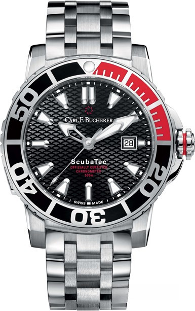 Часы Carl F. Bucherer Patravi ScubaTec изготовлены из нержавеющей стали. Черные и красные керамические вкладки на однонаправленно вращающемся безеле создают тон, идеально гармонирующий с материаом корпуса. Черный циферблат имеет блестящую чешуйчатую структуру c бесчисленными мерцаниями подобно эффекту света, падающего на поверхность моря. Оснащенные гелиевым клапаном, люминесцентными стрелками и индексами, ультра точным автоматическим часовым механизмом и прочным стальным браслетом, часы Patravi ScubaTec – идеальный компаньон для людей, увлекающихся подводным миром. Водонепроницаемостью до 500 м, часы имеют сапфировое стекло с антибликовым покрытием с обеих сторон. Часы являются сертифицированным хронометром COSC.
