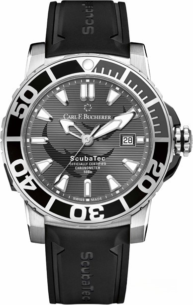 Часы Carl F. Bucherer Patravi ScubaTec изготовлены из нержавеющей стали. Черные и серые керамические вкладки на однонаправленно вращающемся безеле создают тон, идеально гармонирующий с материаом корпуса. Серый гильошированный циферблат. Оснащенные гелиевым клапаном, люминесцентными стрелками и индексами, ультра точным автоматическим часовым механизмом и прочным стальным браслетом, часы Patravi ScubaTec – идеальный компаньон для людей, увлекающихся подводным миром. Водонепроницаемостью до 500 м, часы имеют сапфировое стекло с антибликовым покрытием с обеих сторон. Часы являются сертифицированным хронометром COSC.