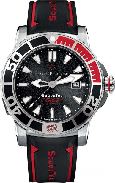 Часы Carl F. Bucherer Patravi ScubaTec изготовлены из нержавеющей стали. Черные и красные керамические вкладки на однонаправленно вращающемся безеле создают тон, идеально гармонирующий с материалом корпуса. Черный гильошированный циферблат. Оснащенные гелиевым клапаном, люминесцентными стрелками и индексами, ультра точным автоматическим часовым механизмом и прочным стальным браслетом, часы Patravi ScubaTec – идеальный компаньон для людей, увлекающихся подводным миром. Водонепроницаемостью до 500 м, часы имеют сапфировое стекло с антибликовым покрытием с обеих сторон. Часы являются сертифицированным хронометром COSC.