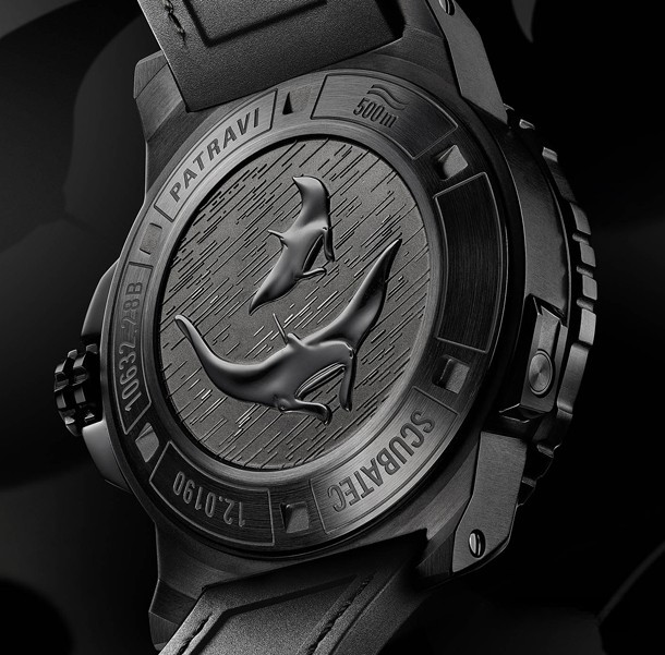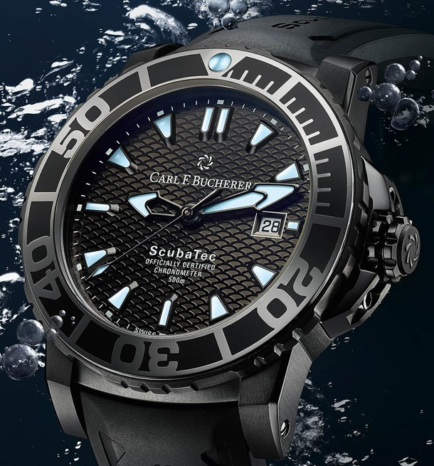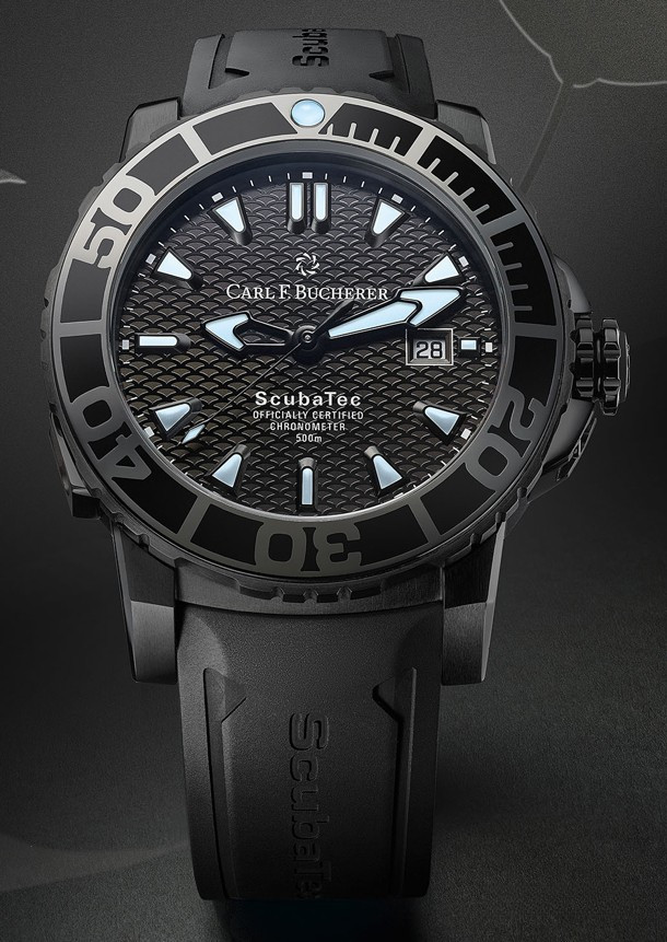 Выпуском часов для дайвинга Patravi ScubaTec мануфактура Carl F. Bucherer поддерживает акцию по защите черных скатов манта. В часах применяется 44.6-миллиметровый корпус и сертифицированный COSC автоматический механизм. Модель поставляется в черном титановом корпусе с DLC-покрытием. Циферблат черного цвета. Часы оснащены гелиевым выпускным клапаном и позволяют погружаться на глубину до 500 метров. Прочный вращающийся безель изготовлен из титана и керамики и повторяет бронзово-черную цветовую гамму часов с указанием 15-минутного обратного отсчета для дайверов. Глубокие выемки на безеле предназначены для того, чтобы помочь дайверам устанавливать время в перчатках. Индексы и кончики стрелок покрыты Super-LumiNova, они излучают голубое свечение в темноте. Апертура даты расположена на 3-х часах. Внутри установлен сертифицированный COSC механизм. Это автоматический Калибр CFB 1950.1 с запасом хода 38 часов, 25 камнями и точностью хронометра. Часы поставляются на черном каучуковом ремешке с раскладывающейся застежкой из титана с DLC-покрытием.