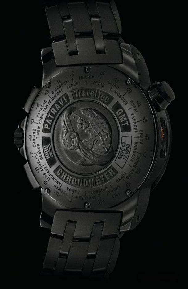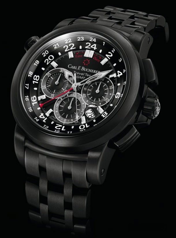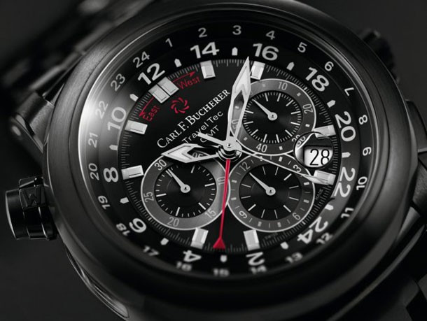 Три часовых пояса, объединенные в одних часах из изысканного и эксклюзивного материала: Patravi TravelTec от Carl F. Bucherer в глубоком матовом черном цвете. Надежное алмазоподобное углеродное покрытие (DLC) превращает GMT-хронограф в весомую «заявку» на вашем запястье, предназначенную не выделяться, а производить восхищение. Удобный функционал, отличная читабельность и технологические усложнения сделали Patravi TravelTec идеальной моделью для постоянных путешественников. Швейцарская мануфактура полностью покрыла модель впечатляющим черным цветом, подчеркнув поверхность корпуса из нержавеющей стали и браслет. Глубокий матовый черный цвет создается уникальным сочетанием углеродного материала. Яркий дизайн подчеркивается черным циферблатом с отчетливым дисплеем с контрастными светлыми счетчиками, индексами и шкалами. Интеллектуальное взаимодействие между корпусом и часовым механизмом делает Patravi TravelTec превосходным спутником, способным отображать время трех часовых поясов одновременно. Два индикатора времени разных часовых поясов расположены на циферблате благодаря сложной функции мануфактурного сертифицированного Калибра CFB 1901.1. Время третьей часовой зоны отображается с помощью красной 24-часовой стрелки на вращающемся безеле. Запатентованная кнопка позволяет владельцу быстро и легко устанавливать время третьего часового пояса при восточном или западном направлении движения.