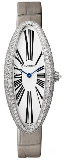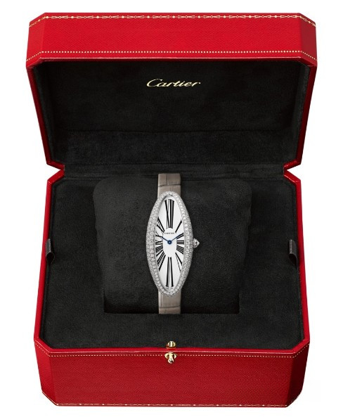 Часы Cartier Baignoire Allongee Medium представлены в овальном корпусе из белого золота 18к размером 47 х 21 х 8 мм. Внутри корпуса установлен механизм с ручным заводом, Калибр 1917 MC, обладающий запасом хода 38 часов. На серебристом циферблате отображаются часы, минуты. Часы поставляются на ремешке из кожи аллигатора с вставкой из белого золота 18к. Водонепроницаемость корпуса составляет 30 метров. Корпус инкрустирован белыми бриллиантами.